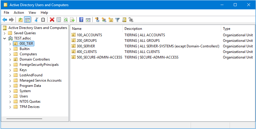 New-ADOrganizationalUnit -Name "340_TIER2" -Path "OU=$TIER_LEVEL_300,OU=$TIER_ROOT,$ADname" -Description "TIERING | ALL SERVERS | Tier2 (bspw. DHCP-Server for Office-Networks, Printserver, RDS-SessionHosts / RDS-VirtualDesktops)"