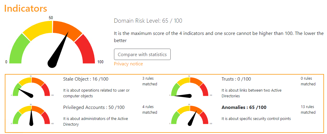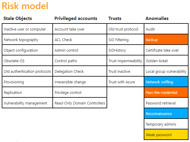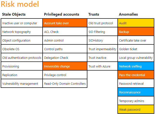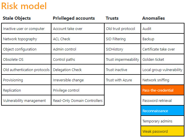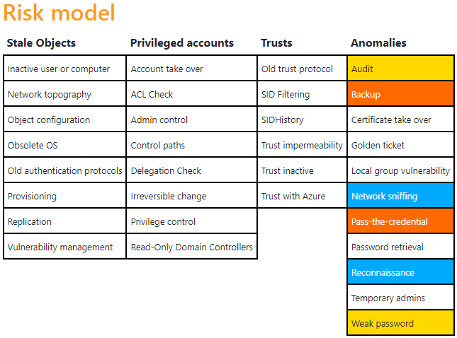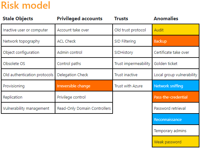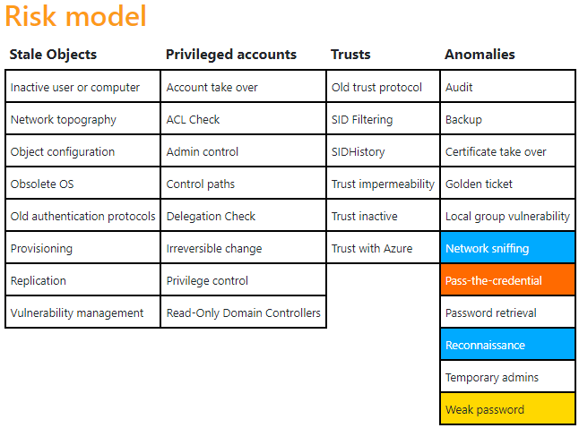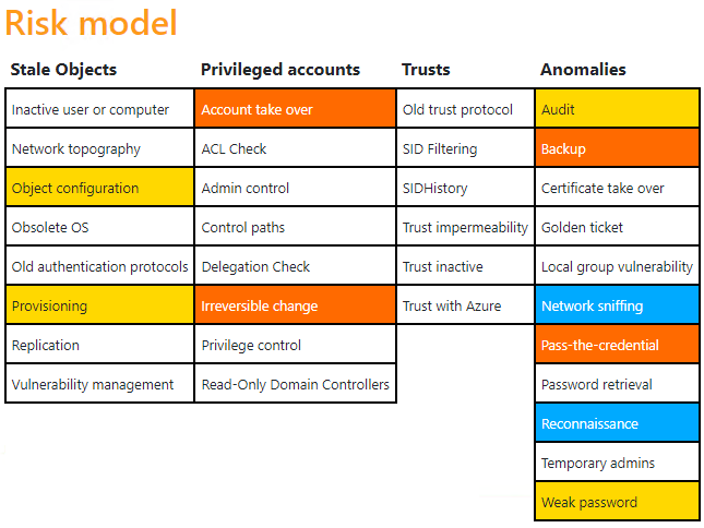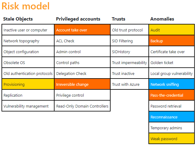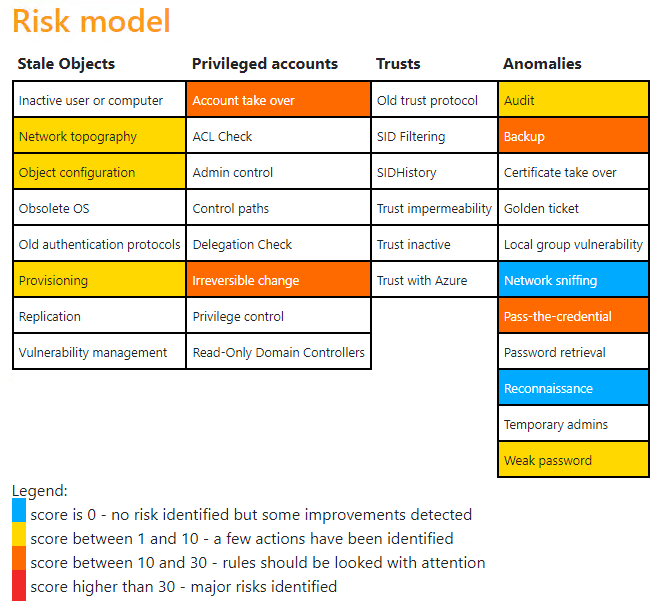 Initial hat eine neue Active Directory einen Risikowert von 65/100. Das Risikomodell stellt dabei eine Verteilung der gefundenen Schwachstellen dar. Im weiteren Verlauf des Artikels wird auf diese initial gefundenen Schwachstellen eingegangen.