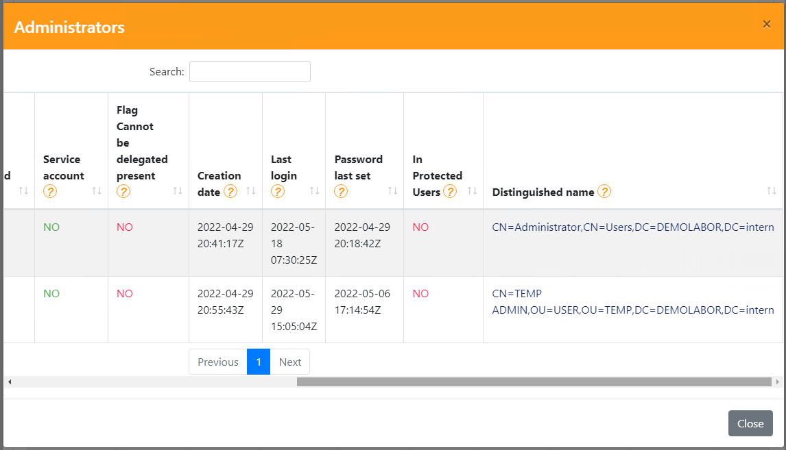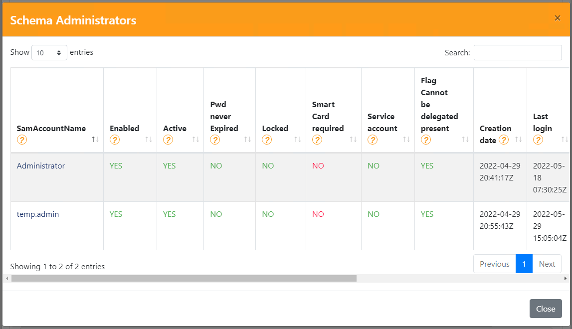- Anzahl der Administratoren-Accounts, die nicht in der Gruppe „Protected Users“ sind