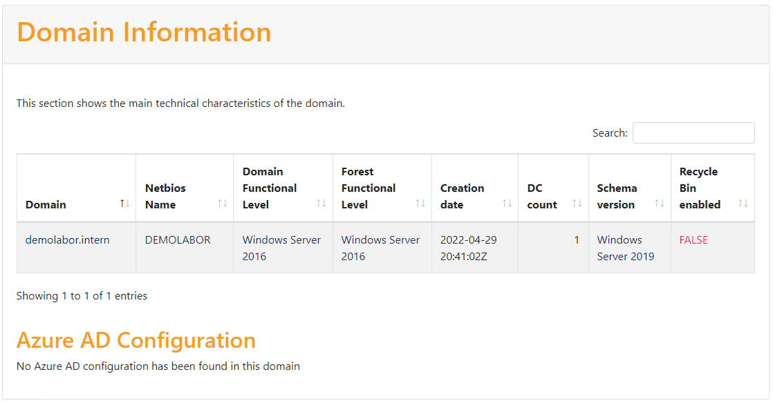 Es ist ein frisch installierter Server mit Windows Server 2022, auf dem ein Active Directory („demolabor.intern“) eingerichtet wurde. Es gibt noch weitere Memberserver für andere Demo-Zwecke (siehe bspw. RemoteApp 2022 – Teil 1), das beeinflusst aber die Analyse nicht.