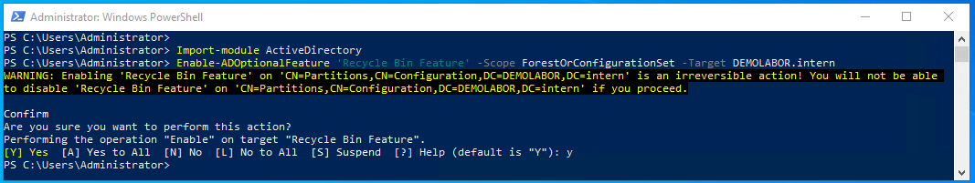 Enable-ADOptionalFeature 'Recycle Bin Feature' -Scope ForestOrConfigurationSet -Target DEMOLABOR.intern