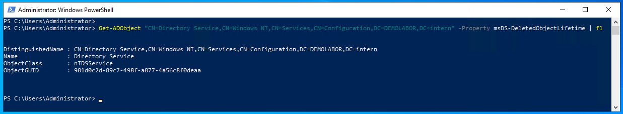 Get-ADObject "CN=Directory Service,CN=Windows NT,CN=Services,CN=Configuration,DC=DEMOLABOR,DC=intern" -Property msDS-DeletedObjectLifetime | fl