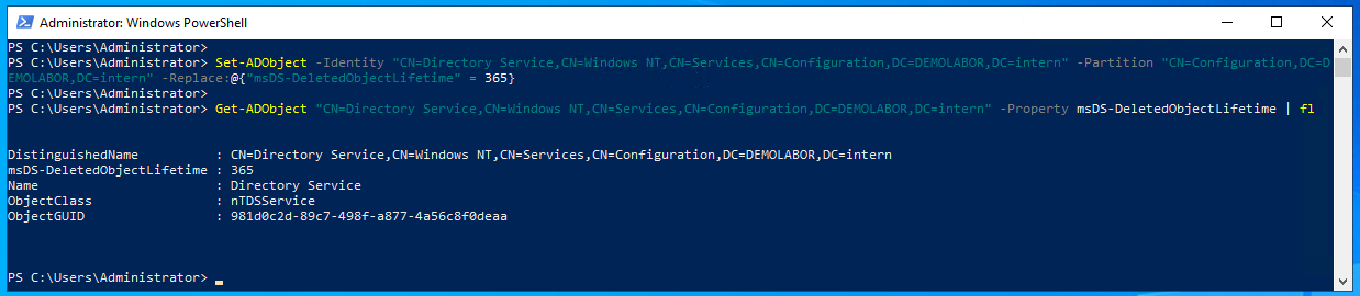 Set-ADObject -Identity "CN=Directory Service,CN=Windows NT,CN=Services,CN=Configuration,DC=DEMOLABOR,DC=intern" -Partition "CN=Configuration,DC=DEMOLABOR,DC=intern" -Replace:@{"msDS-DeletedObjectLifetime" = 365}