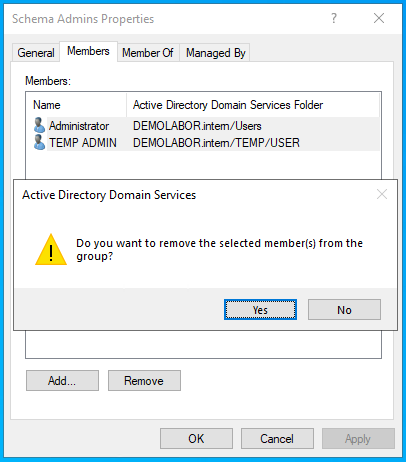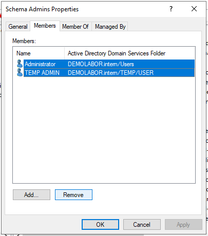 Zum Leeren der AD-Gruppe „Schema Admins“ wird das Tool „AD Users and Computers“ geöffnet, in die AD-Gruppe „Schema Admins“ gegangen, dort dann die bestehenden Accounts entfernt und auf <OK> geklickt.