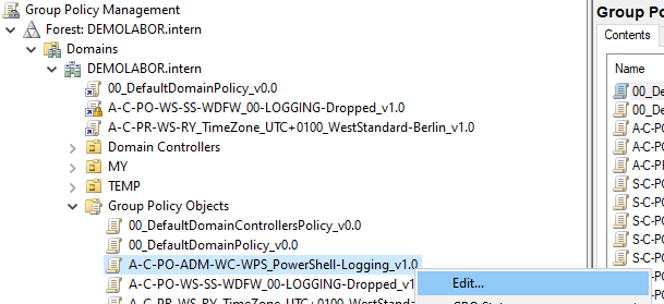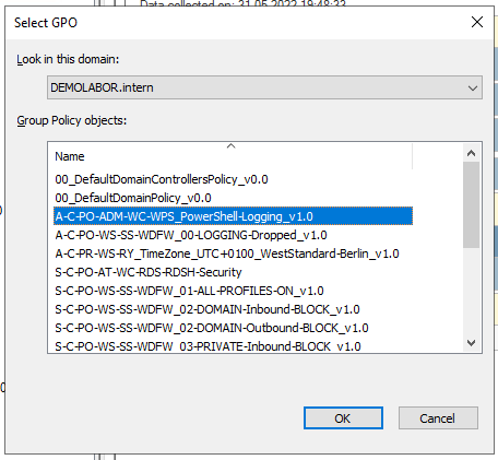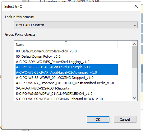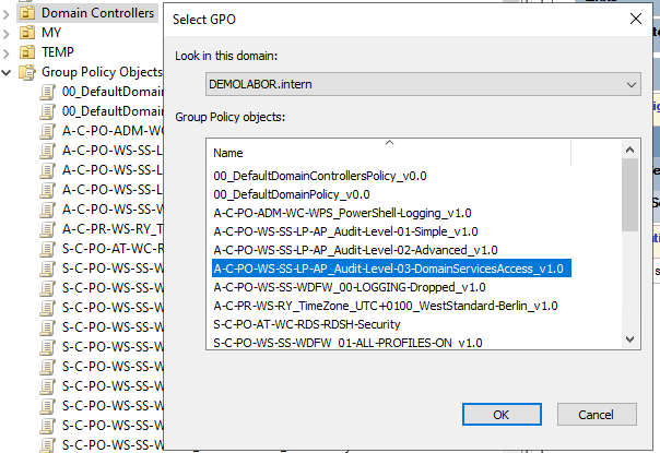 Ich habe im Artikel Einfache Namen für GPOs erläutert, wie ich die Namen der GPOs wähle. Vereinzelt gibt es den Fall, dass von dieser Konvention abgewichen wird, sodass es übersichtlicher ist. In dem aktuellen Fall wird die 3. GPO („A-C-PO-WS-SS-LP-AP_Audit-Level-03-DomainServicesAccess_v1.0″) nicht ganz oben verlinken und greift damit nicht für Alle, sondern nur für die Server des Types Domain Controller. Folgerichtig müsste die GPO eigentlich „S-C-PO-WS-SS-LP-AP_Audit-Level-03-DomainServicesAccess_v1.0″ heißen. Nachteil ist aber, sie ist dann nicht übersichtlich direkt unter den anderen Audit-GPOs, sondern kommt erst wesentlich später bzw. weiter unten bei den Server-GPOs.