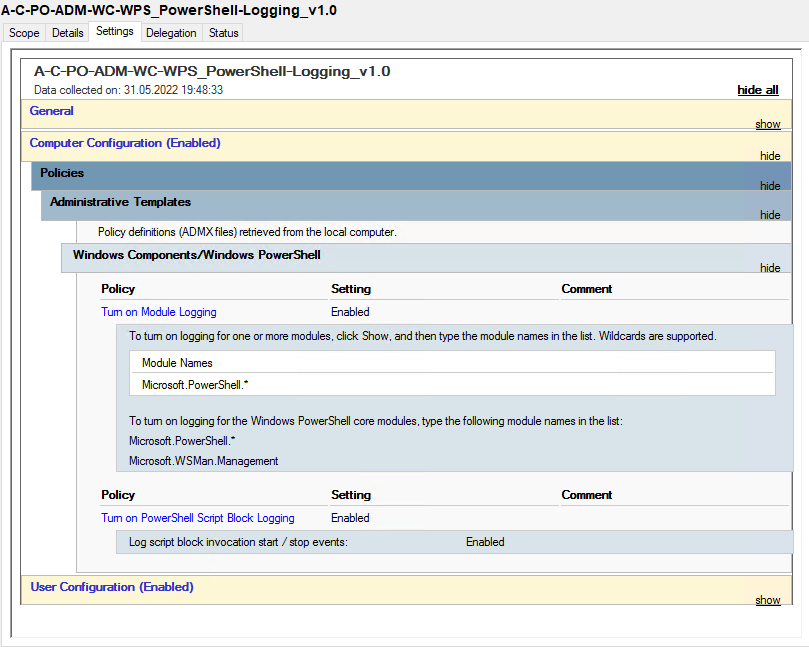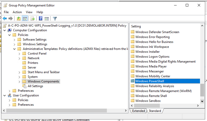 Der erste Punkt wird mithilfe einer GPO gelöst, welche das Auditieren aktiviert. Im Tool „Group Policy Management“ wird die GPO „A-C-PO-ADM-WC-WPS_PowerShell-Logging_v1.0“ erstellt, anschließend im Bereich „Computer > Policies > Administrative Templates > Windows Components > Windows PowerShell“ die Optionen aktiviert: