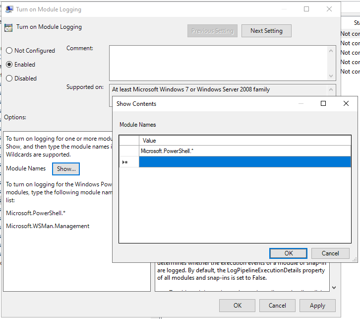 - „Turn on Module Logging“ -> hier als Modul „Microsoft.PowerShell.*“ eintragen