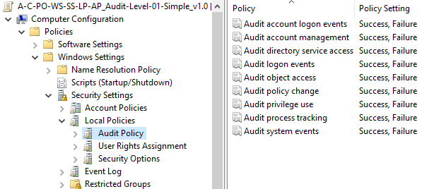 Für die „Simple“-GPO wird im Bereich „Computer Configuration > Policies > Windows Settings > Security Settings > Local Policies > Audit Policies“ alle Policies aktiviert und sowohl „Success“ als auch „Failure“ ausgewählt.