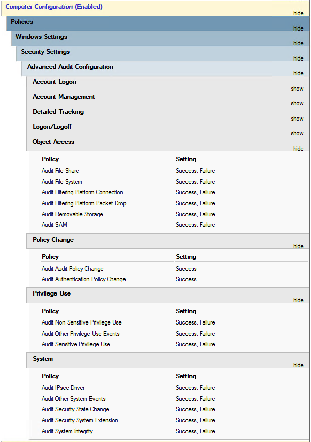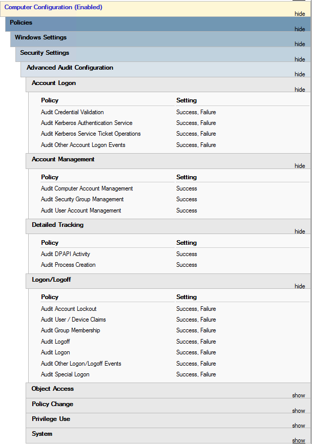 Für die „Advanced“-GPO werden im Bereich „Computer Configuration > Policies > Windows Settings > Security Settings > Advanced Audit Configuration > Audit Policies“ diese Bereiche aktiviert: