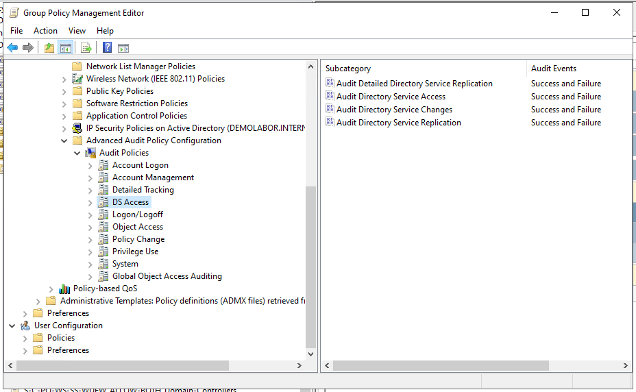 Für die „DomainServicesAccess“-GPO wird im Bereich „Computer Configuration > Policies > Windows Settings > Security Settings > Advanced Audit Configuration > Audit Policies > DS Access“ alle Polices aktiviert und sowohl „Success“ als auch „Failure“ ausgewählt. Anschließend wird sie in der OU „Domain Controllers“ verlinkt.