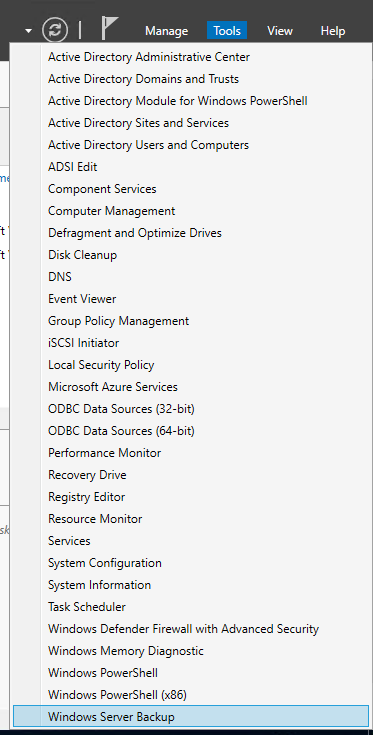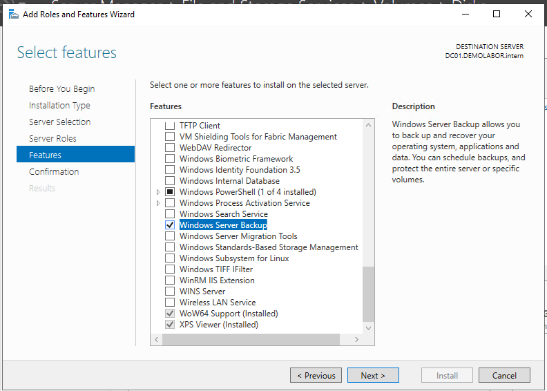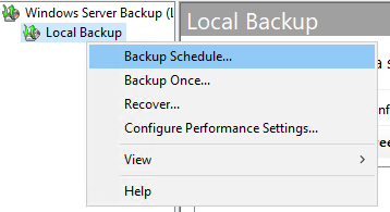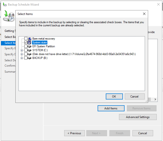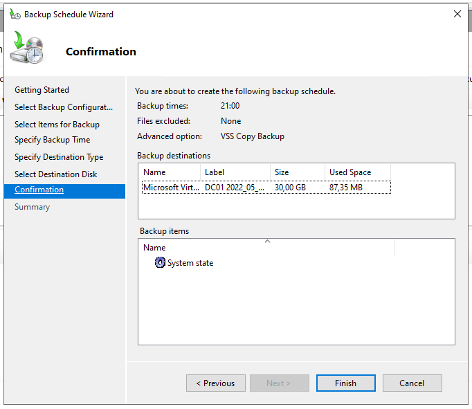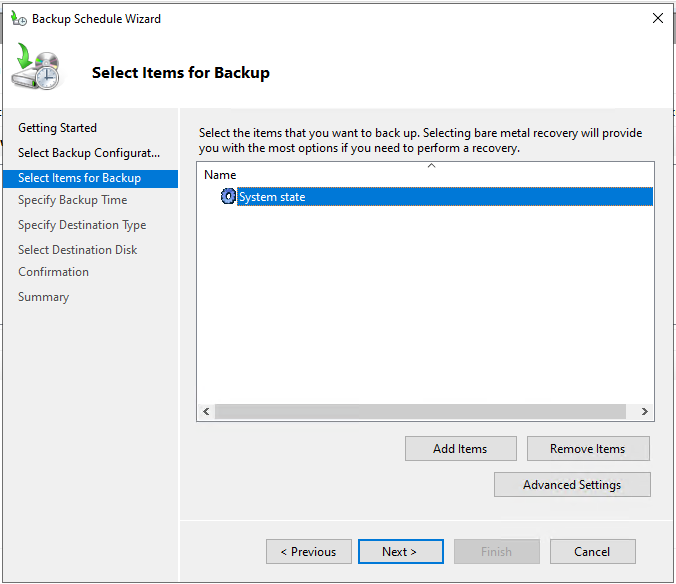 Anschließend das Server Feature „Windows Server Backup“ hinzufügen und dann im Server Manager unter Tools starten. Den „Backup Schedule Wizard“ starten und entsprechend konfigurieren. Wichtig ist hierbei die Option „System State“, alles andere ist beispielhaft eingestellt und muss auf die vorliegenden Bedürfnisse angepasst werden.