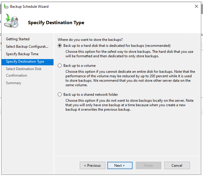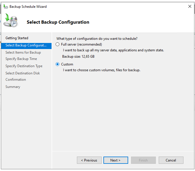 Tipp: Hat man die Domain-Controller virtualisiert und sichert man die gesamte VM nochmal mit einem anderen Tool (bspw. Altaro Backup), reicht die Konfiguration mit „Windows Server Backup“ an dieser Stelle aus. Nutzt man keine Backup-Software oder hat man einen physikalischen Server, würde ich lieber grundlegend „Full server (recommended)“ oder die Option „Bare metal recovery“ auswählen.