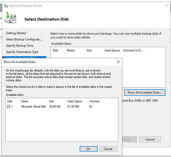 Sofern der Domain-Controller eine VM ist, dann eine weitere VHDX einbinden, formatieren und bereitstellen (ich nehme hier gerne den Laufwerksbuchstaben „B“, wie „Backup“). Ist der Domain-Controller eine physikalische Maschine, dann muss entweder eine interne Platte dafür genutzt werden oder eine USB-Platte oder zur Not auch ein Netzlaufwerk. Achtung: Bei Wahl eines Netzlaufwerkes wird jedoch die Backupdatei jedes mal überschrieben und man kann somit nur auf das letzte Backup zugreifen. Bei einer (USB-)Platte bzw. einer anderen virtuellen Platte kann man auf frühere Backup-Stände zugreifen.