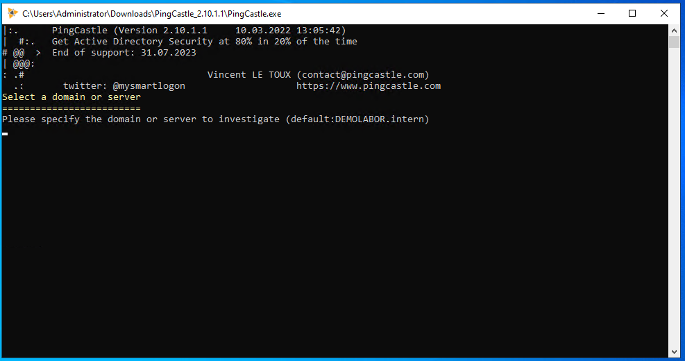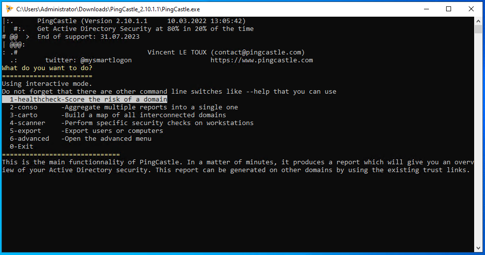 Nachdem Download von PingCastle, kann dies einfach entpackt und ausgeführt werden, eine Installation ist nicht notwendig. Die Anwendung läuft als Consolen-Anwendung und eine Eingabe erfolgt mithilfe von Tastatureingaben, wie bspw. die <ENTER>-Taste.
