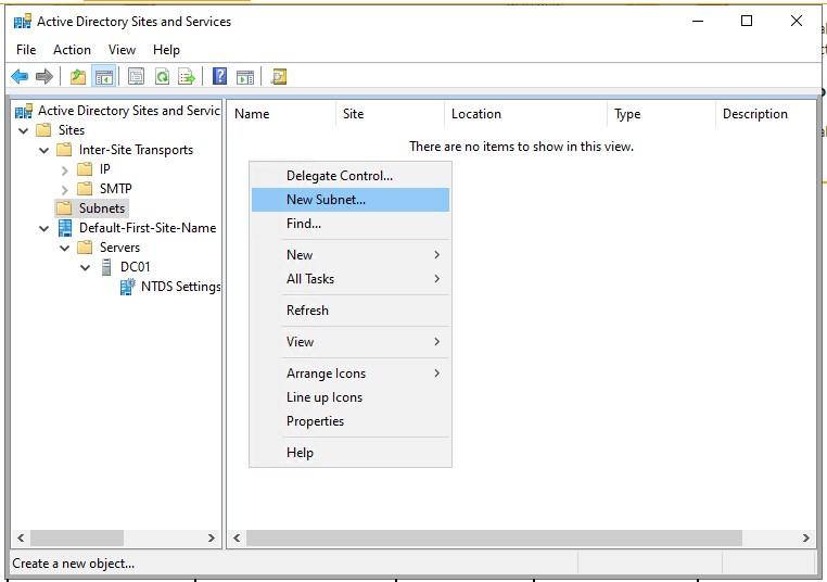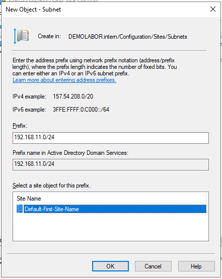 Hier in den Bereich „Sites\Subents“ wechseln, mit einem Rechtsklick das Kontext-Menü öffnen und „New Subnet…“ wählen. Das Prefix eintragen, die Site auswählen (häufig ist diese noch nicht individualisiert und heißt „Default-First-Site-Name“) und auf <OK> klicken.