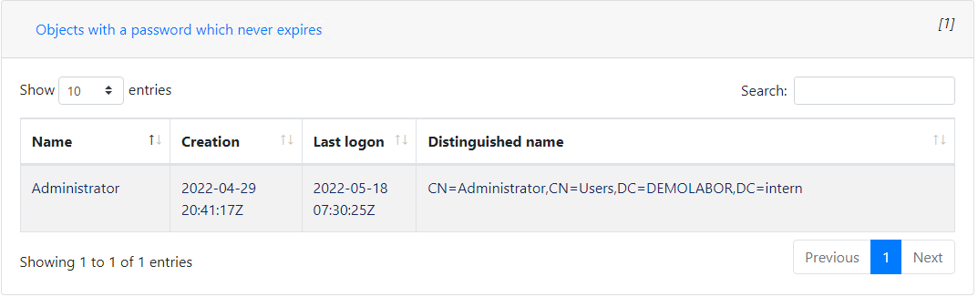 Diese Schwachstelle hat einen Wert von „1“ und sagt aus, dass es mindestens einen Account gibt, bei dem das Kennwort nie abläuft. Wenn man sich die Details anschaut, wird der initial erstellte Account „Administrator“ gelistet.