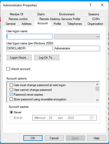 - Im Tool „AD Users and Computers“ die Accounts suchen und in deren Properties gehen