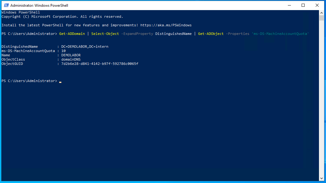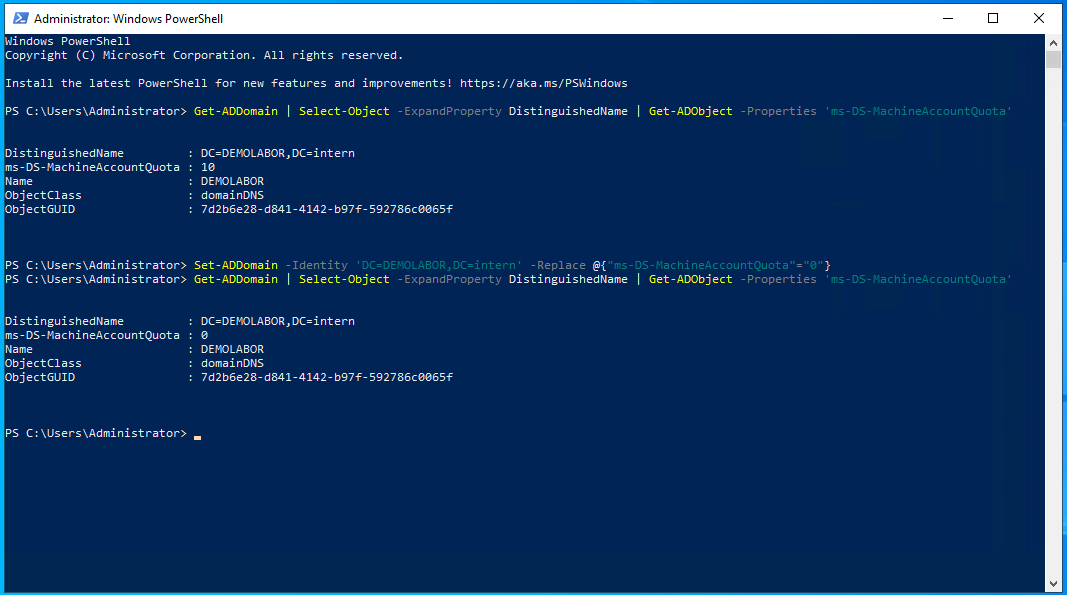 Set-ADDomain -Identity 'DC=DEMOLABOR,DC=intern' -Replace @{"ms-DS-MachineAccountQuota"="0"}