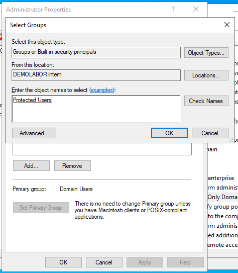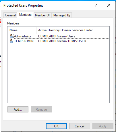 - Im Reiter „Member Of“ in die AD-Gruppe „Protected Users“ aufnehmen und auf <Apply> klicken