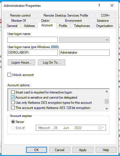 - Im Reiter „Account“ im unteren Bereich den Haken setzen bei „Account is sensitive and cannot be delegated“ setzen und auf <Apply> klicken