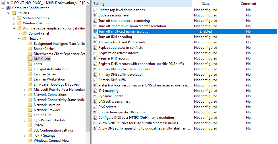 - Es wurde keine GPO gefunden, die „LLMNR“ deaktiviert oder es gibt mindestens eine GPO, die es explizit aktiviert