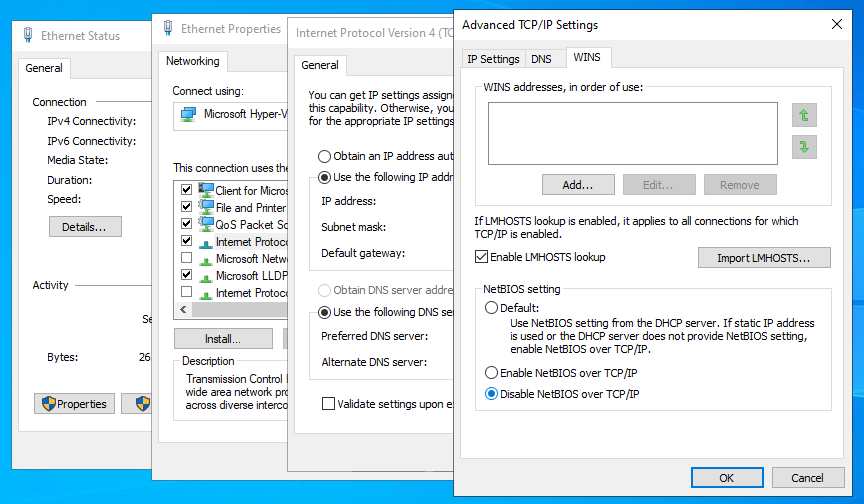 Wenn man nun also LLMNR deaktiviert, sollte man auch gleich einen Blick auf „NetBIOS over TCP/IP“ bzw. „NBT-NS (UDP/137,138;TCP/139)“ werfen, denn dies ist der Vorgänger zu LLMNR. „NetBIOS over TCP/IP“ muss für jede einzelne Netzwerkkarte deaktiviert werden, eine einfache GPO-Steuerung gibt es leider nicht, allerdings gibt es zwei Workarounds: