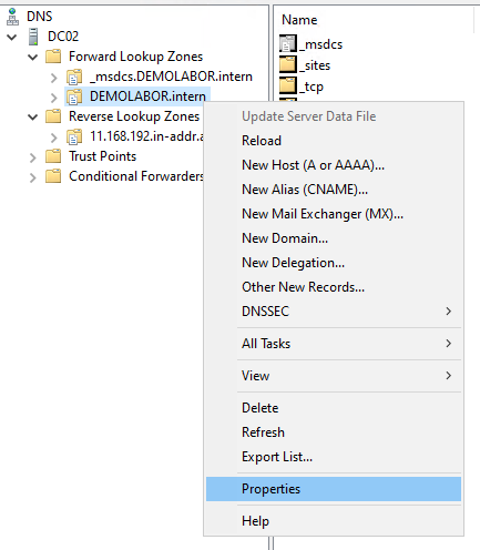 Zum Lösen des zweiten Punktes (Authentifizierte Benutzer können DNS-Einträge erstellen) geht man in die DNS-Server Konsole und macht einen Rechtsklick auf die Forward-Zone der Domäne und wählt im Kontextmenü „Properties“.
