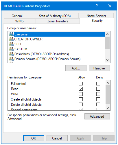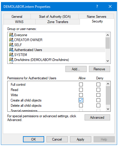 Dann auf den Reiter „Security“ und den Haken für die „Authenticated Users“ bei „Create all child objects“ entfernen und auf <Apply> klicken. Die „Authenticated Users“ verschwinden dann, da sie keine weiteren Rechte hatten. Mit <OK> können die Properties geschlossen werden.
