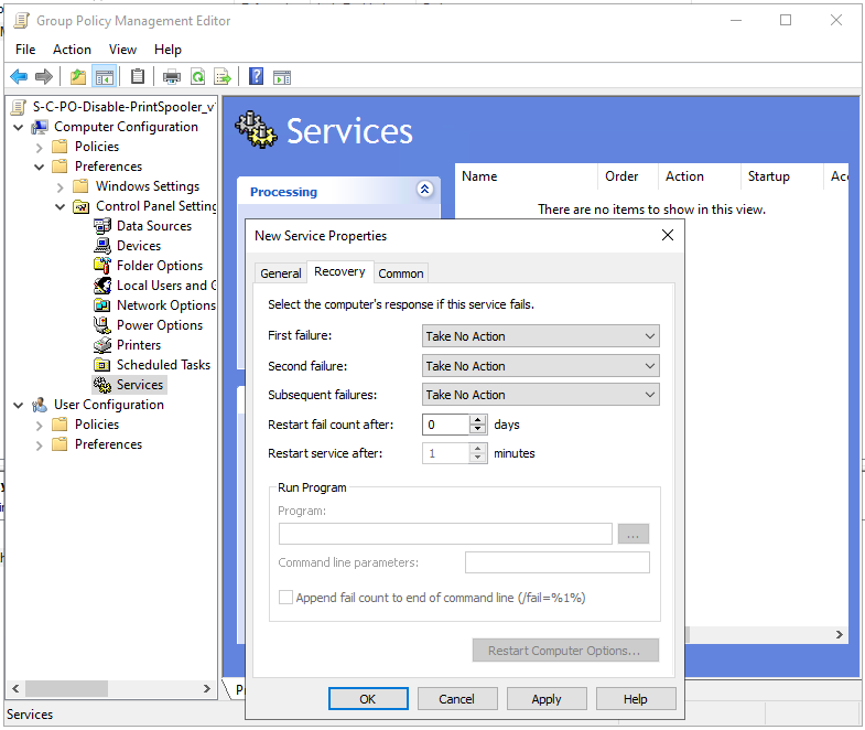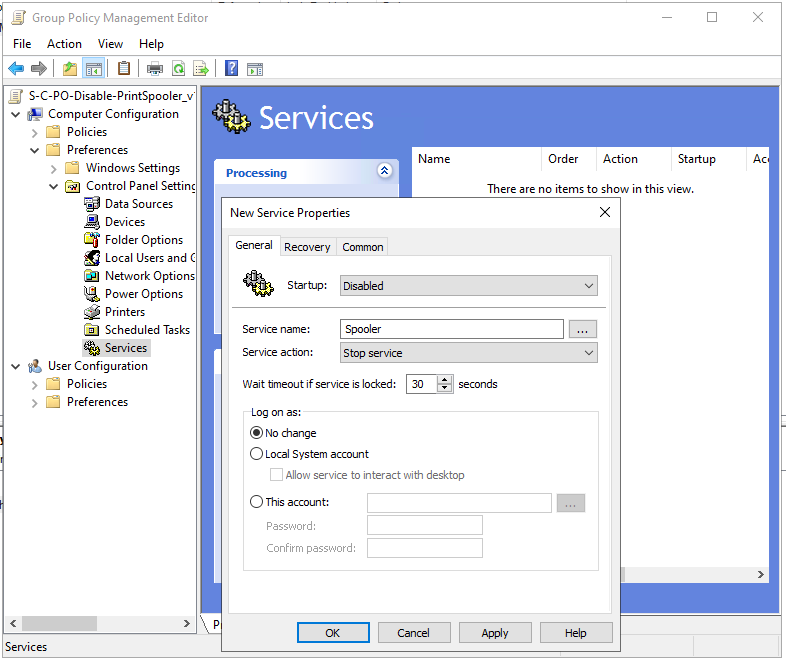Für den ersten Punkt wird die GPO „S-C-PR-CPS-Services_Disable-PrintSpooler_v1.0“ erstellt und im Bereich „Computer Configuration > Preferences > Control Panel Settings > Services“ einen Rechtsklick im rechten Bereich machen und im Kontextmenü die Option „New > Service“ wählen.