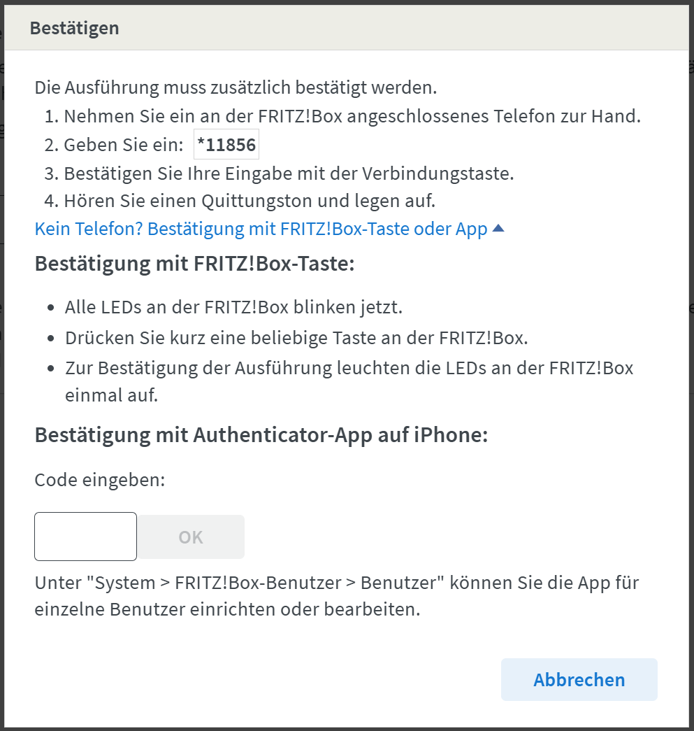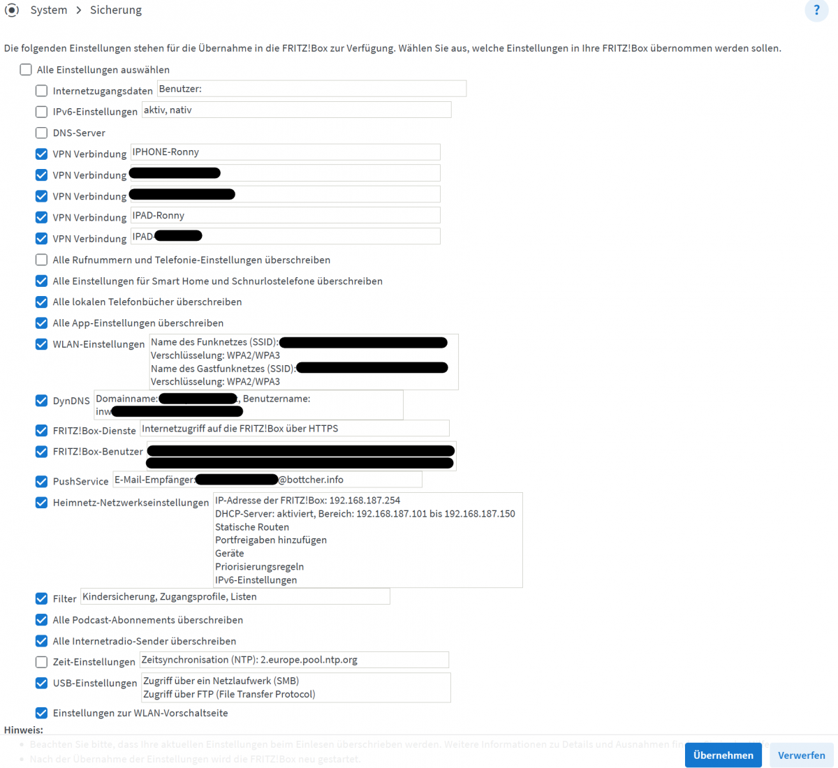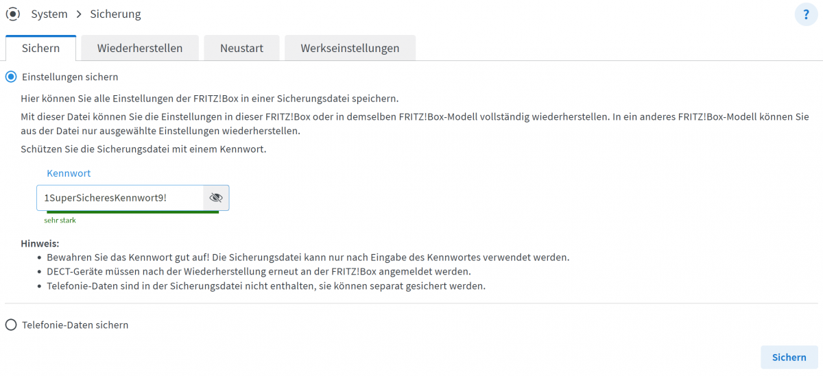 Der Transfer alle relevanten Einstellungen (WLAN, Telefonie, DECT, Updates, etc.) erfolgt ganz einfach per „System > Sicherung“ bzw. „System > Wiederherstellung“.