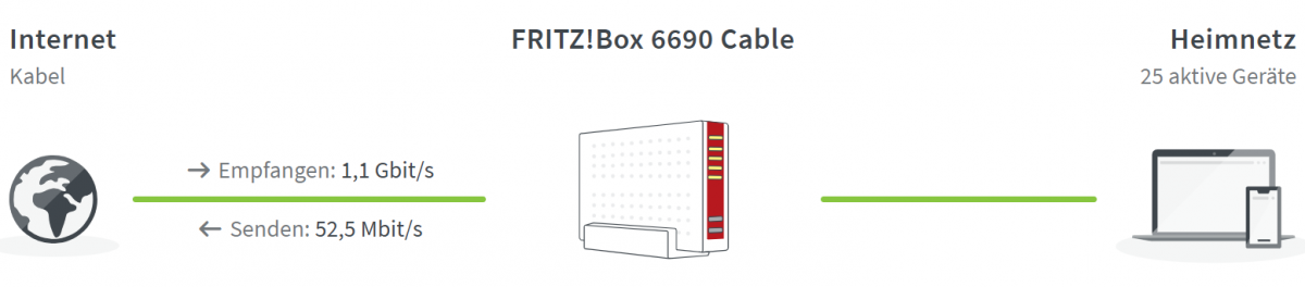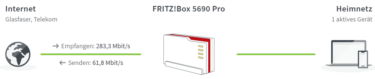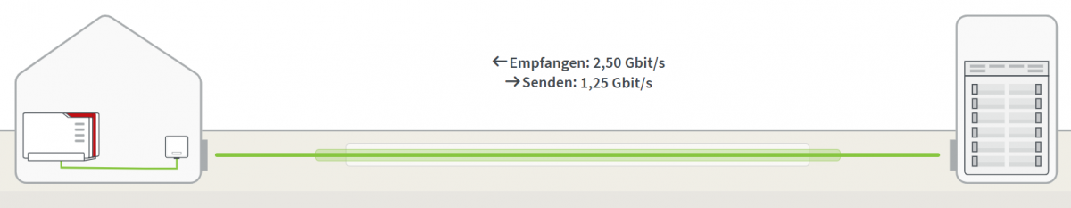 Auch wenn mein Tarif aktuell nur 250/50Mbit (effektiv leicht mehr) ist, könnte die Leitung 2.500/1.250Mbit hergeben – also genug Puffer für die Zukunft 😂