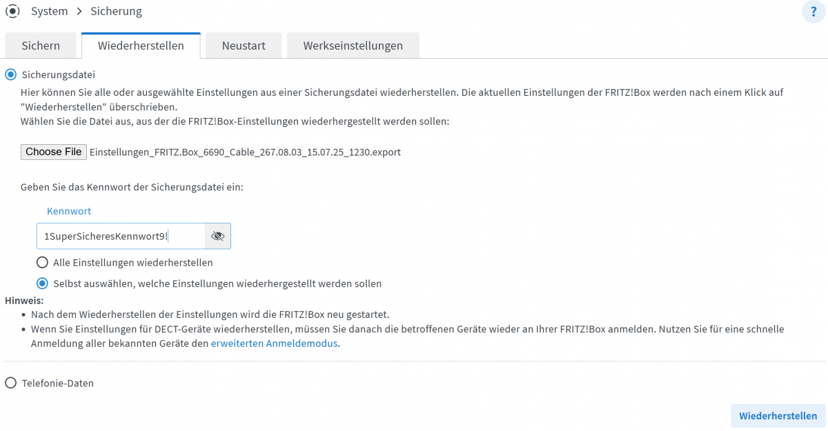 Der Ablauf ist ähnlich; auch hier wird in das Menü „System > Wiederherstellung“ gegangen und dort die gerade eben heruntergeladene Datei ausgewählt, sowie das sichere Kennwort eingetragen. Anschließend die Abfrage auf einen der angebotenen Wege bestätigen. Jetzt können die einzelnen Einstellungen ausgewählt werden.