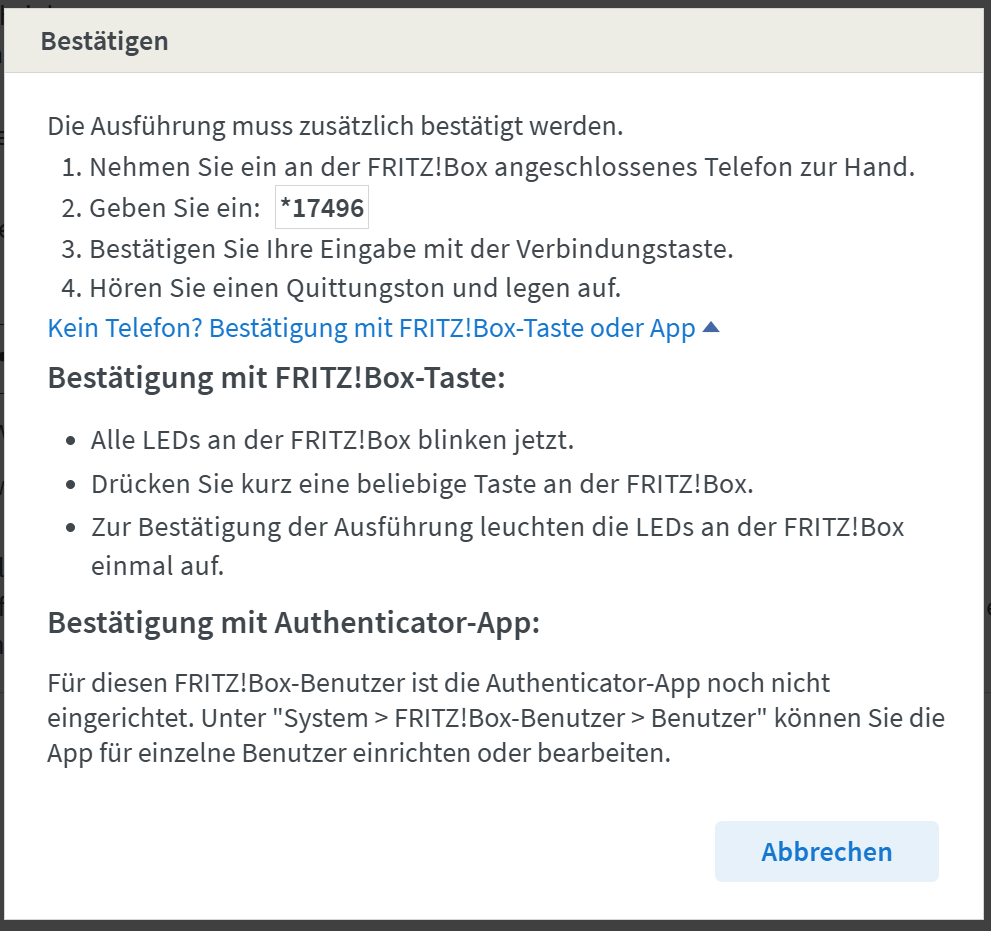 Auf „System > Sicherung“ gehen und die Option „Einstellungen sichern“ auswähle, dann ein Kennwort wählen, um die Sicherungsdatei zu verschlüsseln; anschließend auf [Sichern] klicken. Es kommt ein Dialog zur Bestätigung hoch, welcher auf eine der angebotenen Wege bestätigt werden muss. Danach erfolgt automatisch der Download der Sicherungsdatei.
